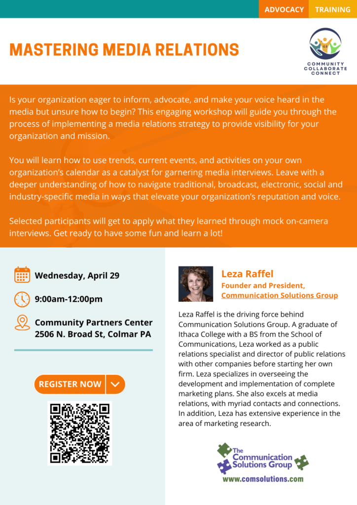 29 April 9:00 am - 12:00 pm C3 | Mastering Media Relations Organizer C3 Website https://cthree.ld-host.com/ REGISTER Location Community Partners Building 2506 N Broad Street Colmar, PA 18915 Category ICNTCN The Community NetworkThe Bucks-Mont Collaborative More Info Read More Share this event + Add to Google Calendar + iCal / Outlook export