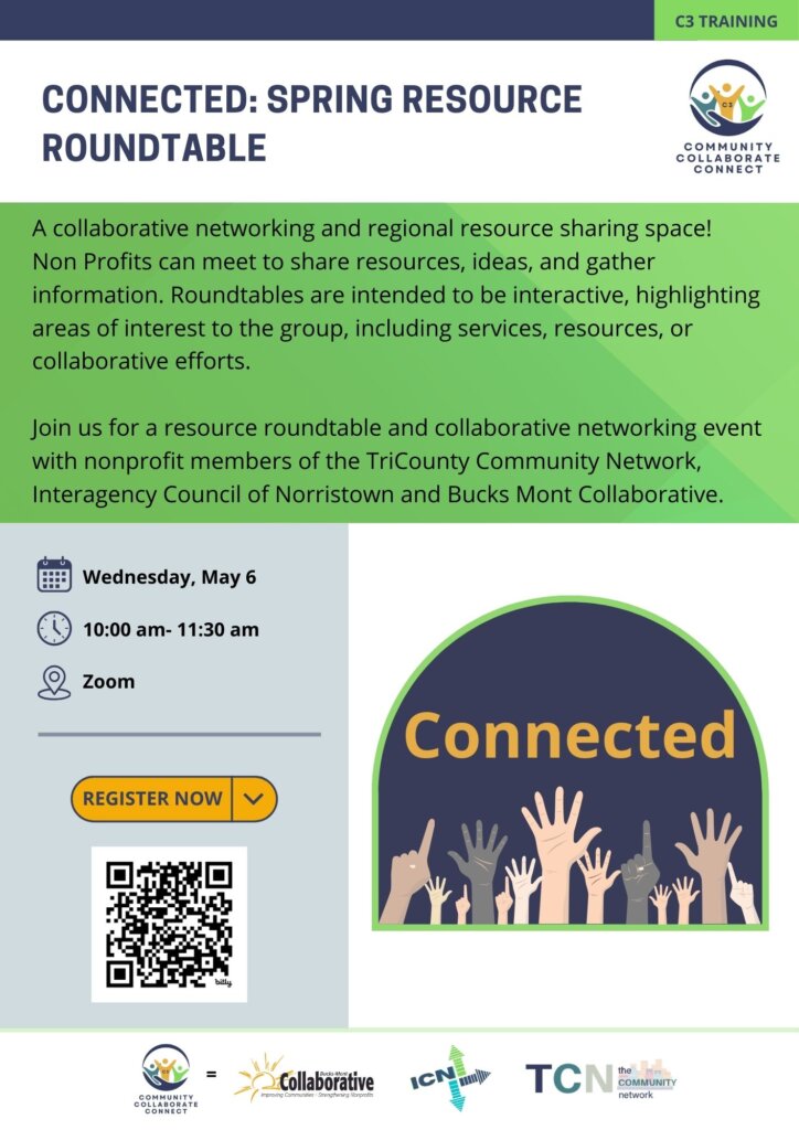 06 May 10:00 am - 11:30 am C3 | Connected: Spring Resource Roundtable Organizer C3 Website https://cthree.ld-host.com/ REGISTER Category ICNTCN The Community NetworkThe Bucks-Mont Collaborative Share this event + Add to Google Calendar + iCal / Outlook export