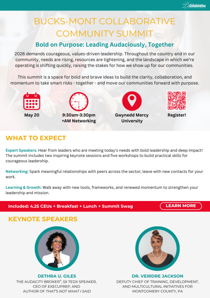 20 May 9:30 am - 3:30 pm 2026 Community Summit | Bold on Purpose: Leading Audaciously, Together Organizer The Bucks-Mont Collaborative Phone 607-425-8898 Email [email protected] Website https://bucksmontcollab.org/ REGISTER Location Gwynedd Mercy University 1325 Sumneytown Pike, Gwynedd Valley, PA Website https://www.gmercyu.edu/ Category Community SummitThe Bucks-Mont Collaborative More Info Read More Share this event + Add to Google Calendar + iCal / Outlook export