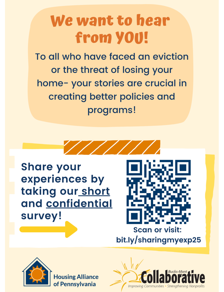 Thank you to everyone who has already helped shared our eviction experience survey—our partners at the Housing Alliance of Pennsylvania have seen a noticeable uptick in responses from Bucks and Montgomery Counties.