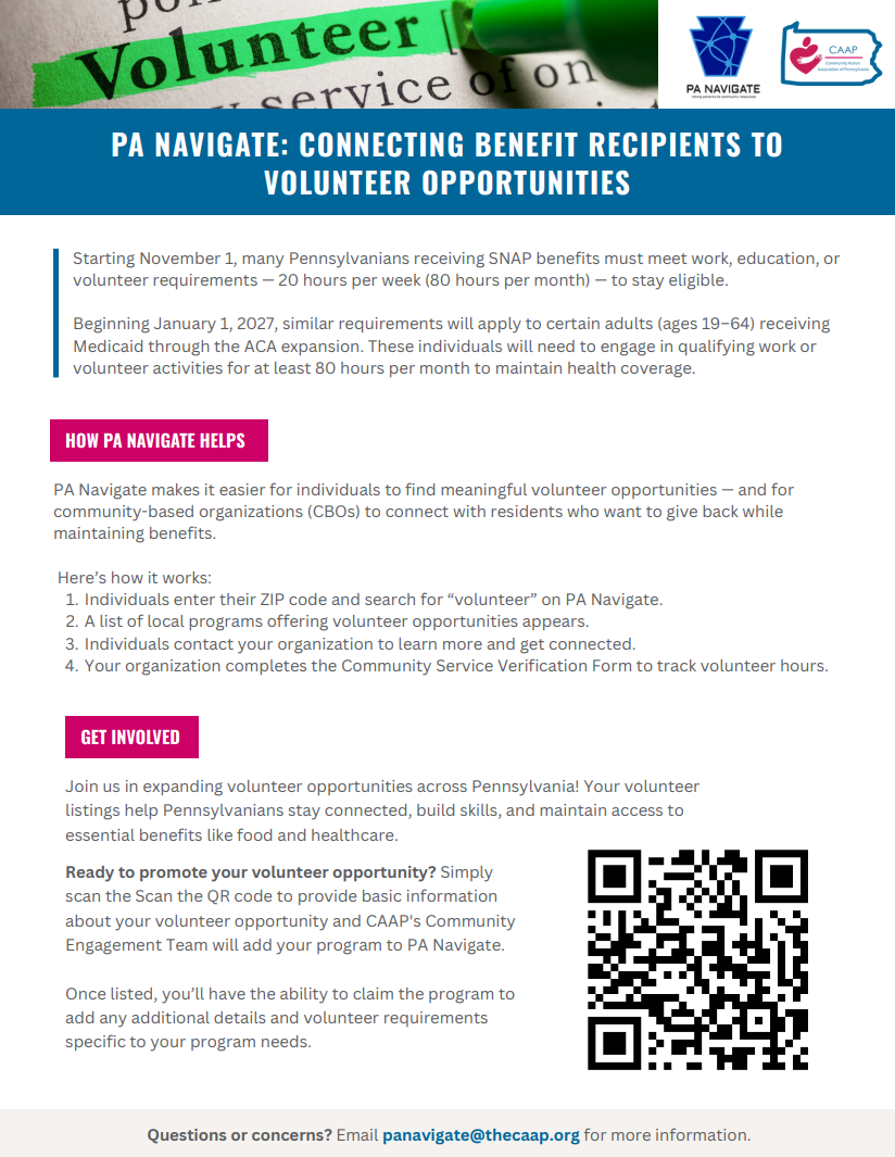 To help SNAP recipients and applicants find out if they need to meet this requirement, the Pennsylvania Department of Human Services (PA DHS), has launched a new online screening tool. The screening tool is not a final determination of whether someone is meeting the work requirements or is eligible for an exemption, but it can help recipients and applicants have a more informed conversation with their caseworker.