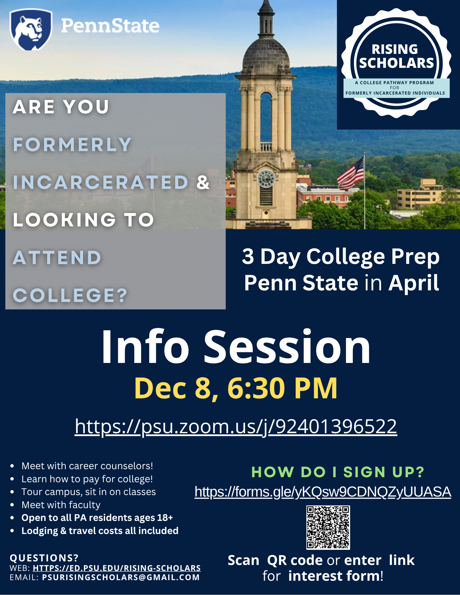 Rising Scholars is a college and career readiness program for formerly incarcerated individuals who are thinking about college or professional training. The program includes a three-day college preparation event at Penn State University Park in April 2025, where participants will: