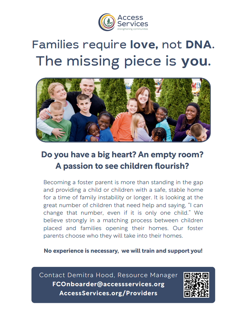 If you have ever considered becoming a foster parent, join us for this free information session to learn more about the difference you can make in the life of a child and the process of becoming a foster parent! You will have the opportunity to get answers to any questions you may have as well.