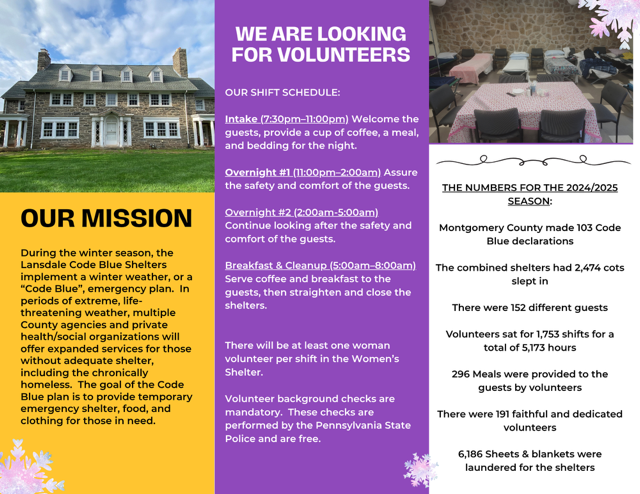 Upper Bucks Code Blue Ministry of Advocates for the Homeless of Upper Bucks (AHUB) provides a warm bed and hot meal to unhoused neighbors in Upper Bucks County on cold winter nights from November 15 to April 15. Join this incredible team of volunteers! Learn more here.