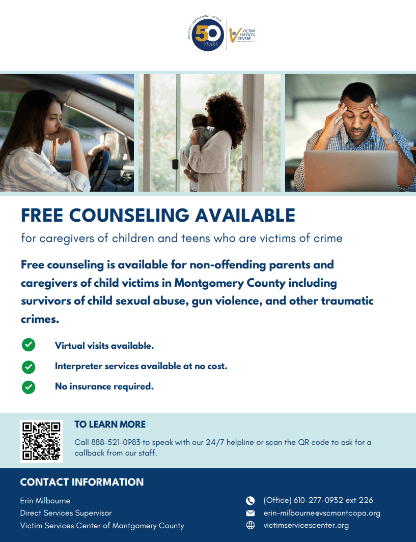Victim Services Center of Montgomery County | Free counseling available for parents an caregivers of children & teens who are the victim of crime. Learn more.