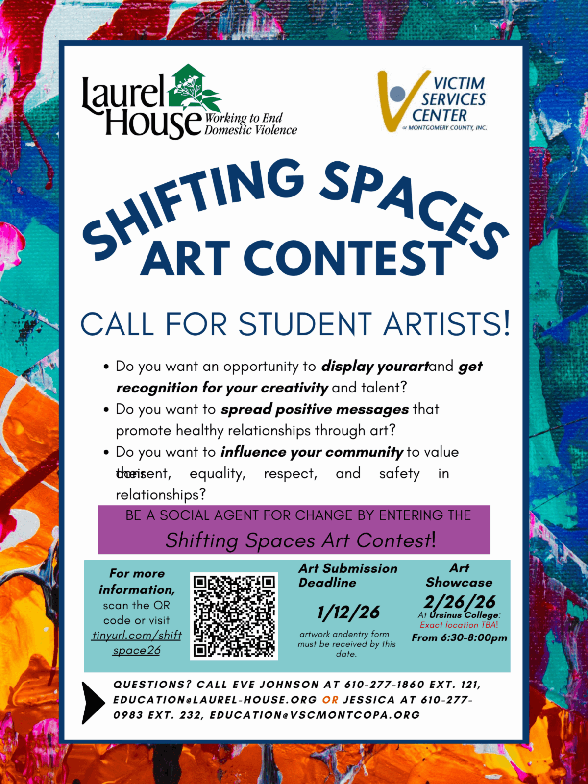 Laurel House & Victims Services Center | Shifting Spaces Art Contest Call for Student Artists Do you know a student looking to help in the fight against domestic violence? The Shifting Spaces Art Show is an opportunity to spread positive messaging about healthy relationships and influence friends, family, and more to value respect, safety, and trust in relationships. The deadline to sign up is Monday, January 12, 2026 and the showcase will be on February 26! Submit your art here!