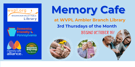 People impacted by memory issues and those caring for them are invited to the opening of Memory Café on October 16 at the Ambler Branch! Memory Café will meet once a month and provide an opportunity for people living with dementia to socialize, make new friends, enjoy refreshments and participate in a variety of activities in a safe and welcoming setting. Registration Required: Call or Text Sharon Pachler at 908-612-3883 or email [email protected].